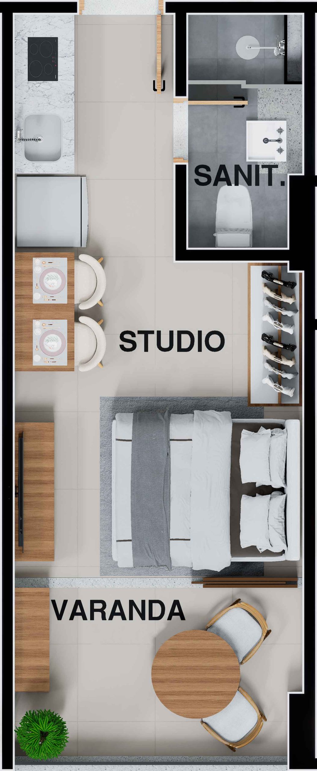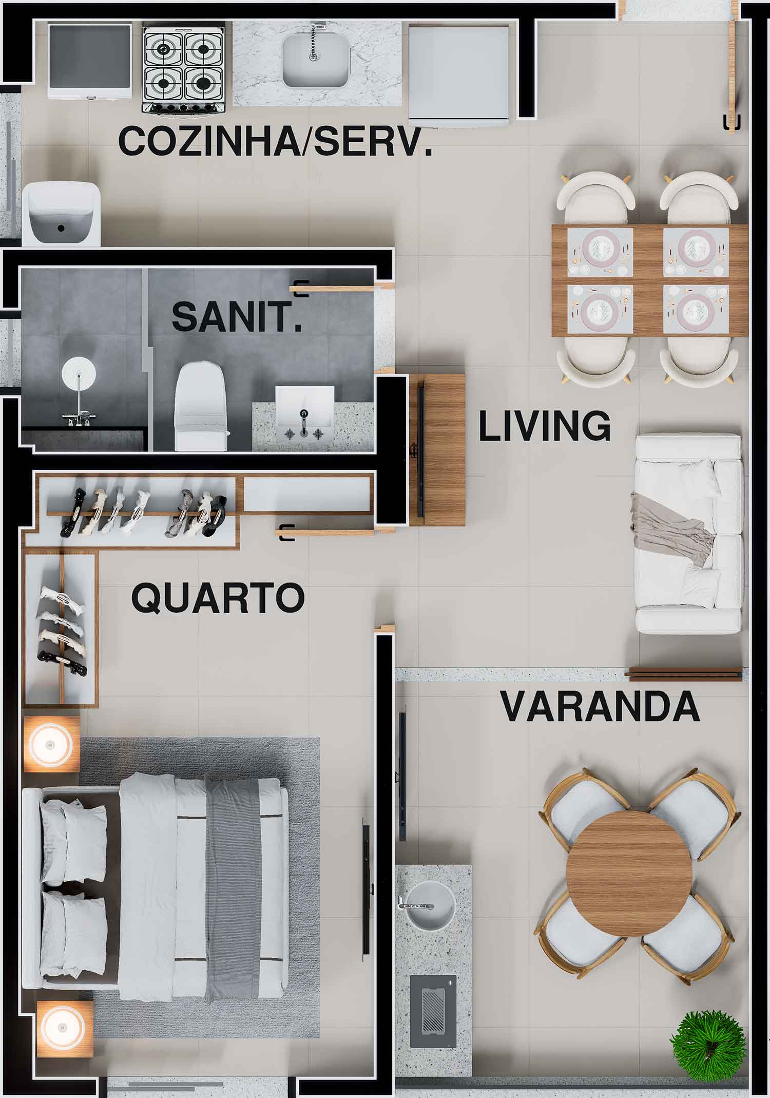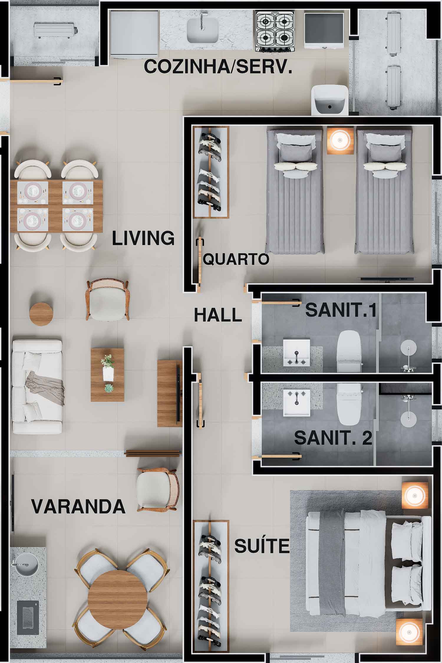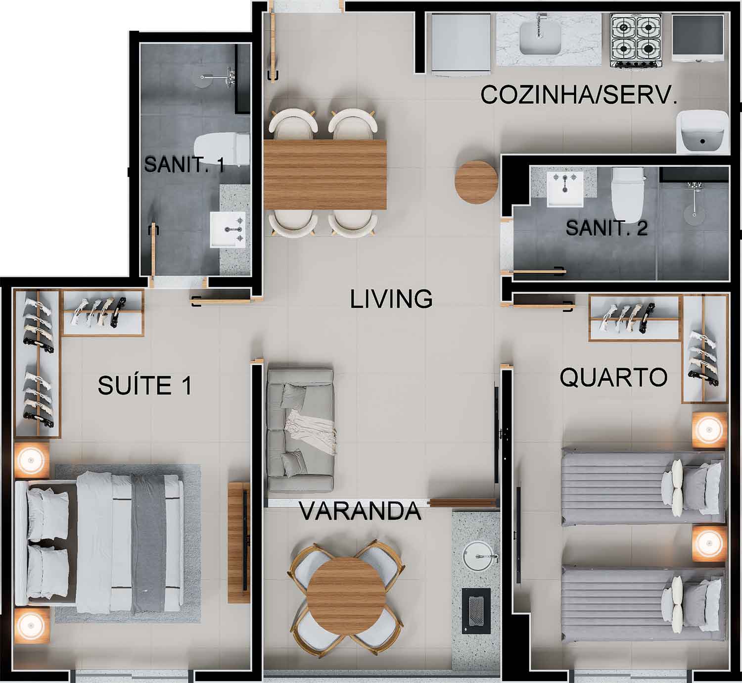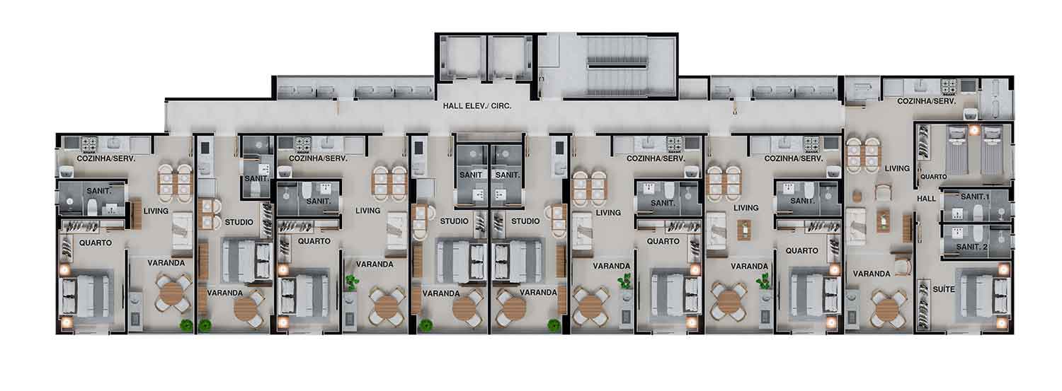 - Studios, quarto e sala 02 quartos com suíte.